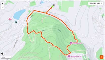 Danach geht es auf Waldwegen abwärts – teilweise steil – bis zum Badesee. Von dort führt die Strecke über die Straße zurück zur Sportplatzstraße und schließlich ins Ziel.